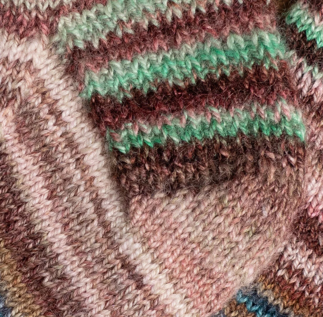 Something Happy Cowl by Samantha Guerin knitted by me using chain plied yarn (hand dyed OOAK colorway by Mary Ann of Three Waters Farm) and Solstice by Plymouth Yarn